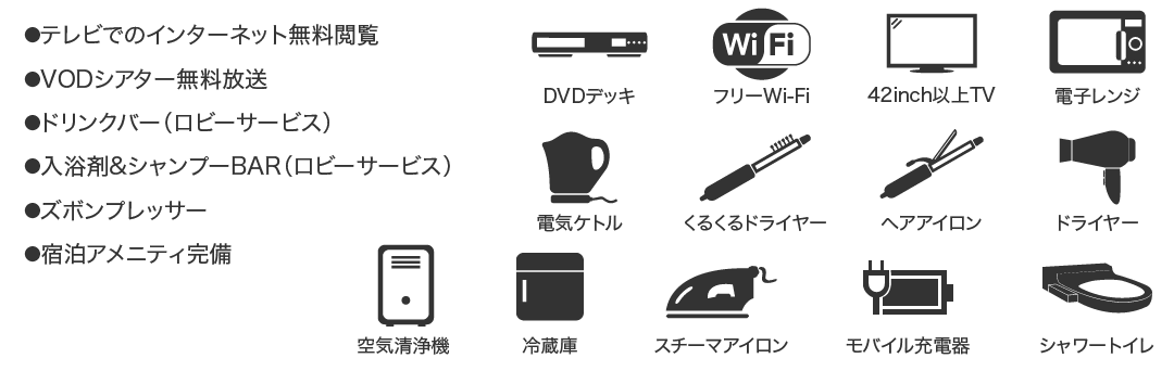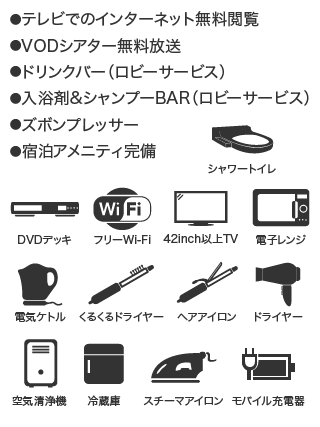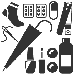 常備薬、爪切り・毛抜き、ソーイングセット、除光液などの日常品を無料貸出しております。また、急な宿泊時などに必要な、下着、ストッキング、靴下、ビニール傘、コンタクト保存液などを取り揃え、館内販売しています。